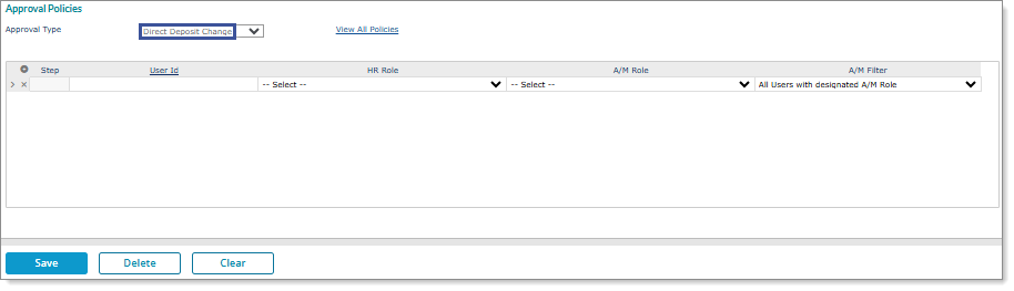 Important! There must be a client-level or global-level approval policy in place to use this feature. (Without an approval policy, the system immediately records any changes and applies them to the employee record.) In addition, the approval policy only applies when an employee changes, adds, or removes the Transit Number or Account Number in the direct deposit information.