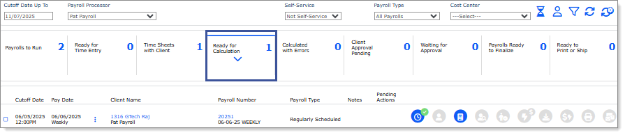 After payrolls are enabled, click Ready for Calculation in the ribbon, which displays all payrolls ready for calculation (identified by
